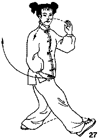 В данном случае необходимо указать на следующие моменты: первое, дугообразный шаг этой формы принадлежит к такому типу дугообразного шага, как «упрямый». Необходимо во избежание напряжения и искривления бедер, что влияет на стабильность стойки, придерживаться поперечного размера дугообразного шага, равного примерно 30 см; второе, практика тренировок свидетельствует, что начинающим сложно овладеть дугообразным типом шага и способом передвижения. Например, таким незначительным требованием к овладению шага, как необходимость направления носка впередистоящей ноги, согнутой в виде дуги, строго вперед. Обычно практикующиеся, даже после многочисленных тренировок, нередко разворачивают стопу наружу. Еще один пример: при выполнении конечного положения шага пятка сзадистоящей ноги должна плотно прижиматься к поверхности и разворачиваться назад; не контролируя данные требования, новички располагают сзадистоящую ногу перпендикулярно средней линии. Поэтому, прежде чем изучать движения данной формы, необходимо правильно выполнять типы шага и четко понимать внутреннее содержание движений.